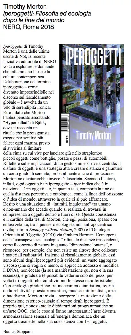 I wrote a review for Flash Art Italia of the Italian edition of Timothy Morton’s book Hyperobjects, published by NERO. You can read it in Flash Art Italia 340 Luglio – Settembre 2018 or below.